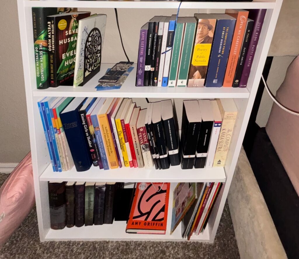 Five books from the right is a collection of poetry by Pablo Nuruda. The collection I own was printed in both Spanish and English, reflecting the original language of publication. I learned of this poet from a Taylor Swift music video in which she uses a line of poetry by him, “love is so short, forgetting is so long.”